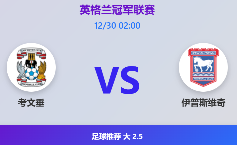 12 月 30 日凌晨 02:00,英格兰冠军联赛将迎来一场重头戏,考文垂坐镇主场迎战伊普斯维奇。本场比赛备受关注,不仅因为两队近期状态火热,而且两队之间的交锋历史多次出现高比分,通过近期比赛数据分析,本场比赛预计进攻端将有较多动作,本场比赛预测大2.5。