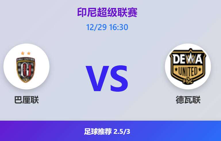 12月29日16:30,印尼超级联赛将上演一场备受期待的对决——实力不俗的巴厘联坐镇主场,迎战风格开放的德瓦联。从近期双方展现的比赛内容和数据走势深入分析,本场比赛极有可能演变为一场精彩的对攻战,总进球数值得高看,大球方向可期(参考:大2.5/3)。