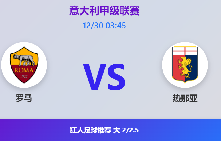 12/30 03:45 意甲:罗马VS热那亚预测大 2/2.5。从近期战绩分析,罗马与热那亚的比赛风格呈现出鲜明的对比,这为本场可能出现的较多进球埋下了伏笔。罗马近期状态起伏但进攻端渐入佳境。球队近10场正式比赛虽然胜负参半,但进攻火力显著复苏,尤其在欧联杯赛场连续攻入2球或以上(对格拉斯哥流浪者、凯尔特人、中日德兰),展现了强大的外战攻击力。回到意甲,虽然面对强敌(如AC米兰、那不勒斯、尤文图斯)时进攻受阻,但在对阵中下游球队(如乌迪内斯、科莫、帕尔马)时均能取得进球并取胜。值得注意的是,罗马防线并不稳固,近6场意甲仅有1次零封(对阵乌迪内斯),面对克雷莫纳、帕尔马等保级队也有失球。主场作战的罗马有强烈的抢分需求以稳固欧冠资格竞争,其战术很可能采取主动进攻的姿态。