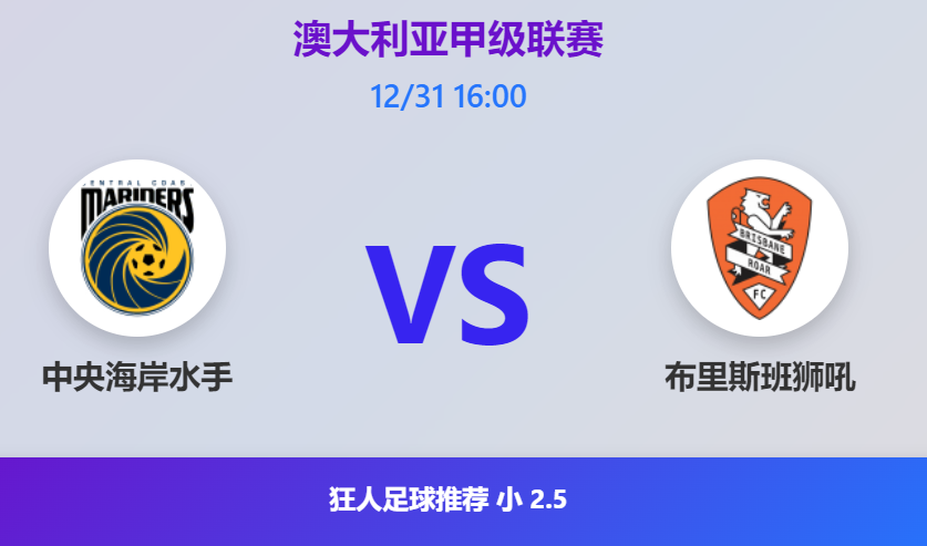 12月31日 16:00 ,澳大利亚甲级联赛将迎来一场颇具看点的对决,中央海岸水手坐镇主场迎战布里斯班狮吼。从双方近两个月的联赛表现来看,这场比赛更可能呈现出节奏谨慎、防守优先的走势,进球数不宜高看。本场比赛预测小2.5球。