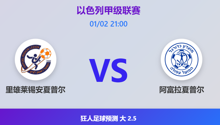 01月02日21:00,以色列甲级联赛:由里雄莱锡安夏普尔坐镇主场迎战阿富拉夏普尔。从双方本赛季的整体表现和交锋走势来看,本场比赛进球数偏多的可能性较大,本场比赛预测:大2.5球。